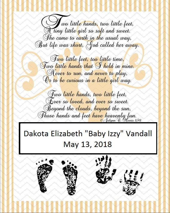 Dakota Elizabeth Vandall “Baby Izzy” passed away on May 13, 2018. She never took a breath, or enjoyed the many things her family thought she would be able to do but she will be remembered and deeply loved. Dakota is survived by pa Read Obituary